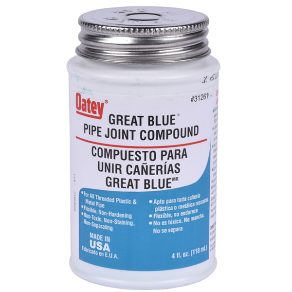 Oatey Great Blue Pipe Joint Compound is a non-separating thread sealant formulated to seal threaded connections on metal and plastic pipe up to and including 2′ diameter.