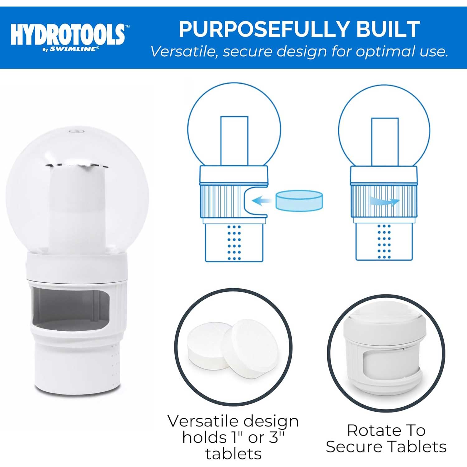 - Holds 1-inch or 3-inch Tablets – Works with both chlorine and bromine tablets.